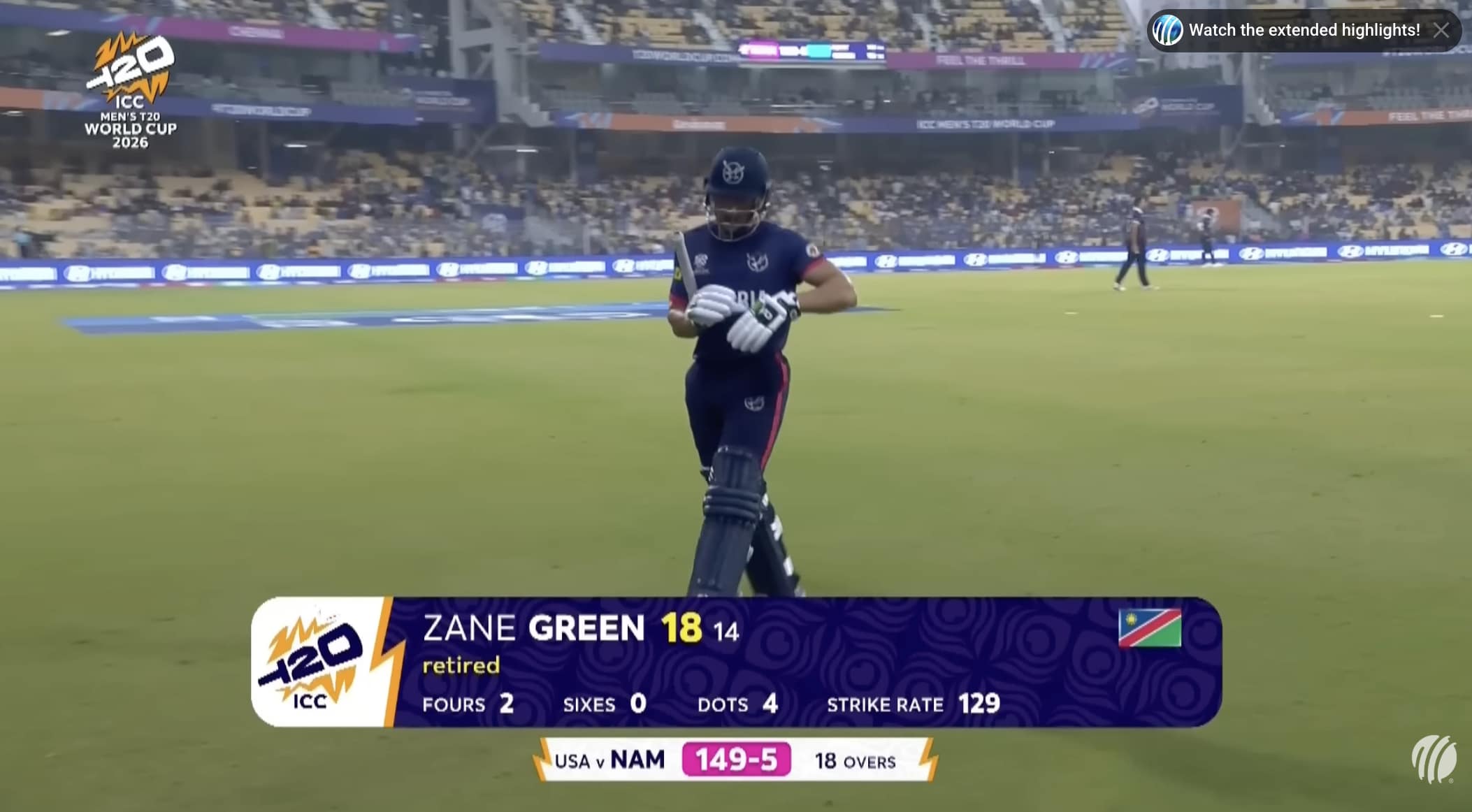 The United States of America produced a commanding all-round performance to defeat Namibia by 31 runs in their ICC Men’s T20 World Cup 2026 clash at the MA Chidambaram Stadium on Sunday.